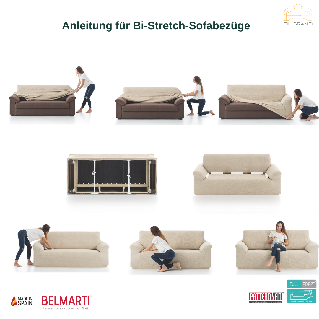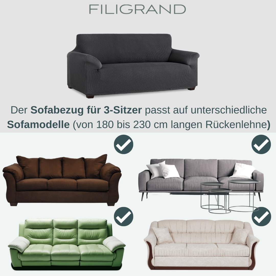 Leicht aufzuziehen und zu fixieren. Der weiche und pflegeleichte Stoff schützt dein Sofa vor Schmutz und Abnutzung. Der Bezug in hochwertiger Qualität mit samtiger Oberfläche ist geeignet für alle Arten von 3-Sitzer (mit Polsterfugen) mit einer Gesamtbreite der Rückenlehne von 160 bis 210 cm (gemessen von Arm zu Arm).